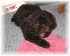 had chocolate fur and green eyes, I was in love! I looked down and in the nickname box, it said Trooper. It was meant to be, I was in total shock and showed my family his picture and we all fell in love.